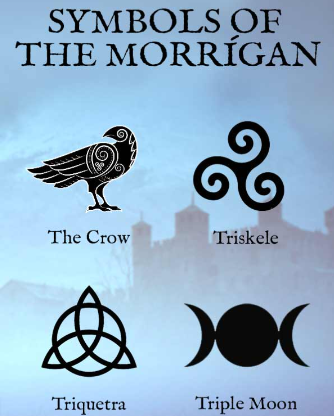 The Morrigan is known as a triple goddess, the goddess of war, death and fate. Her associations include death, fate, healing, fertility, prophecy, spell casting, and ferocity. Symbols that represent The Morrigan are the crow, triskele, triquetra, and the triple moon.